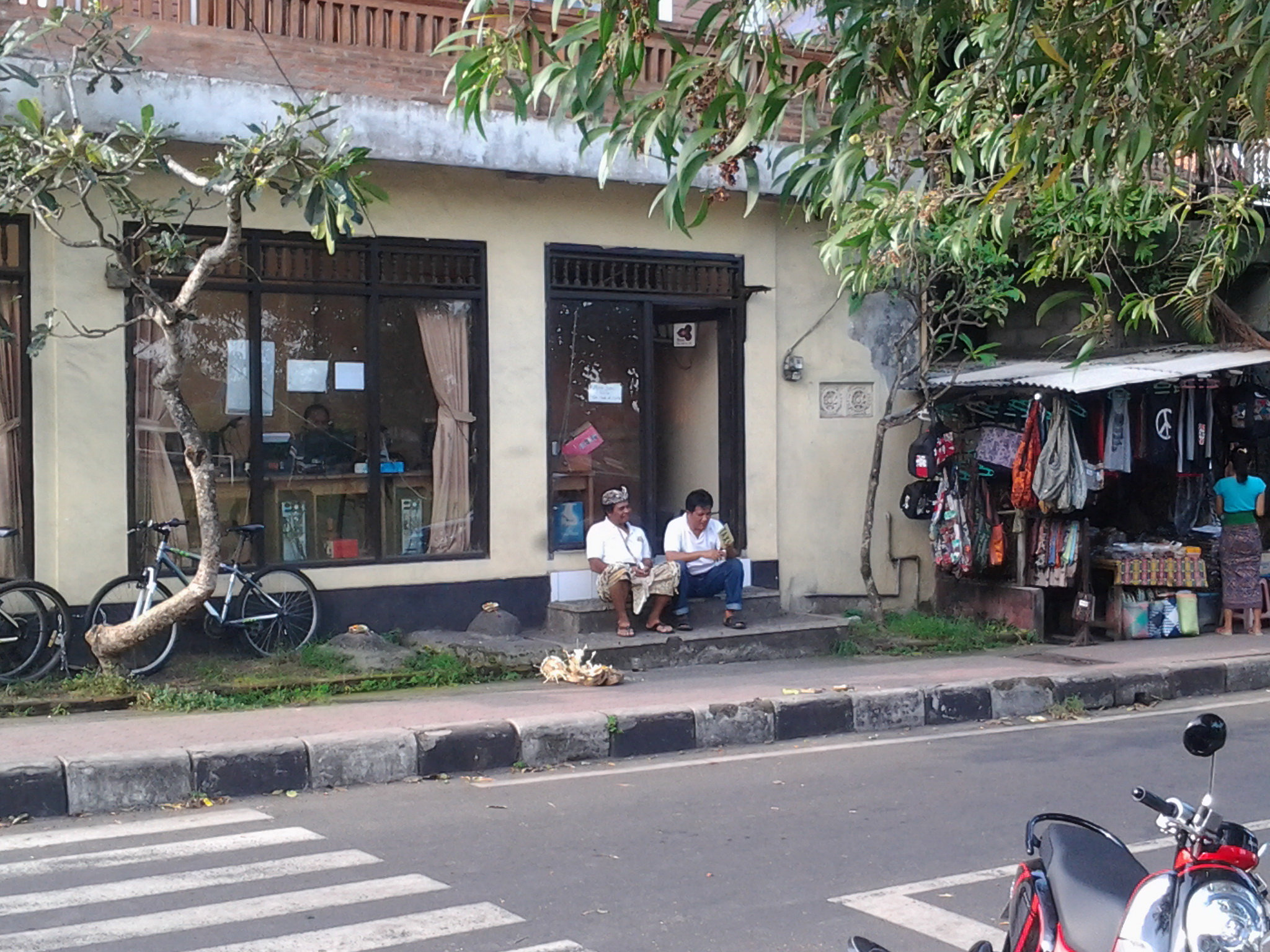Zo’n 8 jaar geleden ging ik daar voor het eerst zitten aan het begin van de avond. Voorbijgangers bekijken, praatje maken met de daar zich ophoudende jongens, die toeristen op hun brommers vervoerden, voor een kleine geldelijke vergoeding. Er kwamen dames langs, die koffie uit een thermoskan verkochten, anderen verkochten snacks en weer anderen bungkus nasi (goreng). Ook kennissen, die in Ubud woonden, kwamen langs. De laatste roddels werden besproken. Met mijn dierbare Ineke (en ook met anderen) heb ik daar vreselijk veel gelachen en plezier gehad. Op dat kleine stoepje zater we soms wel met 8 man tegen elkaar gedrukt. Het was uitermate gezellig, iedereen kende elkaar.