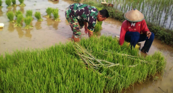 De kleine rijstplantjes (bibit), die uitgeplant worden