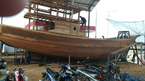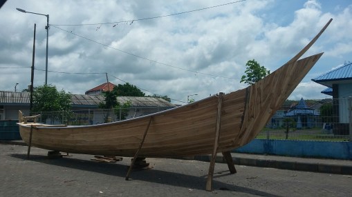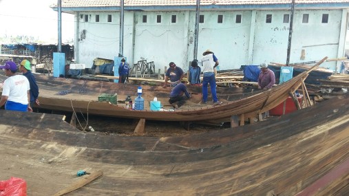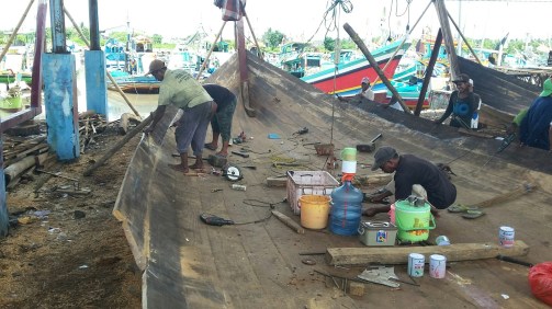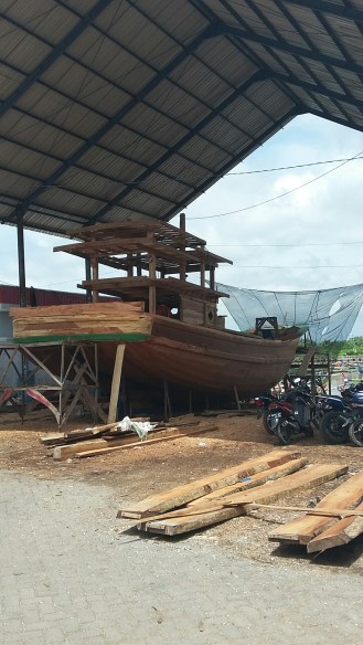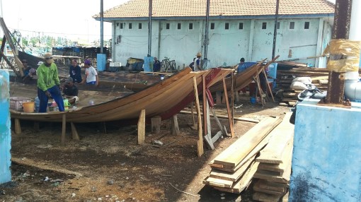 Op ruim een half uur rijden van mijn desa ligt het vissersplaatsje Puger. Op het terrein van de haven is een kleine werf, waar nieuwe houten boten worden gemaakt. Ook worden er houten boten gerenoveerd. Toen ik de foto’s nam, waren 3 boten in de maak. De boten zijn helemaal van hout, er worden echter wel spijkers gebruikt; deze zijn steviger dan houten pluggen, zo werd mij verteld.