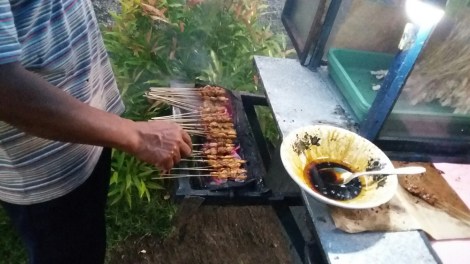 Om de andere dag komt langs mijn huis de Tukang Sate. Zijn keuken is achterop de brommer. Het is sate van kip. 10 stokjes voor rp 5000, ongeveer 35 eurocent. Het wordt ter plekke bereid. Het kan “pedas” (scherp) of niet. Buitengewoon smakelijk !