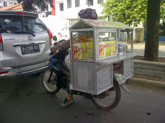 De man op de foto hierboven verkoopt bakso. Het wagentje, dat hij gebruikt, heet een “kaki lima” – een vijf-voeter: 2 wielen, 2 benen en 1 stut (links). Na afloop van het zakendoen wordt de kaki lima naar huis geduwd. Deze kaki lima’s ziet men overal in Indonesie.