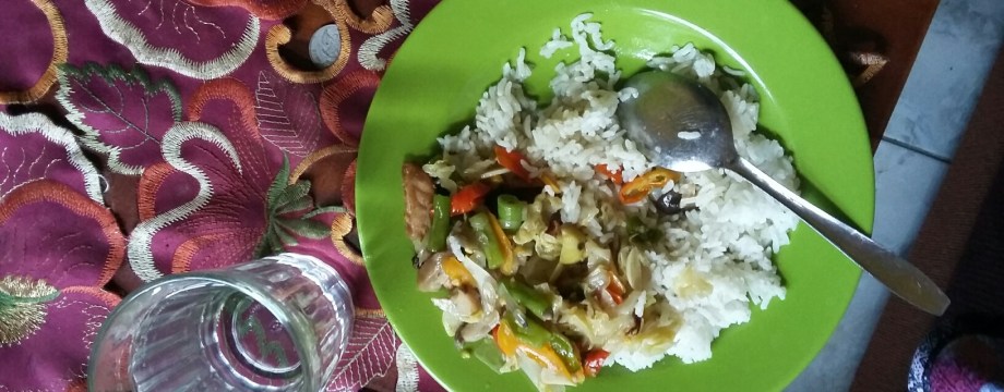 Ik heb al meer middagmaaltijden gepubliceerd hier en U ziet, dat het dagelijks eten in mijn regio zeer eenvoudig is. De indonesische maaltijden, die in Nederland worden verkocht in de restaurants, hebben niets te maken met het eten hier op Java. Babi panggang is taboe (varkensvlees), kip in ketjapsaus onbekend in mijn regio, van rijsttafel heeft niemand gehoord. De nasi goreng in nederland is niet te vergelijken met de nasi goreng hier. Gado gado komt voor, maar is veel eenvoudiger dan in nederland.