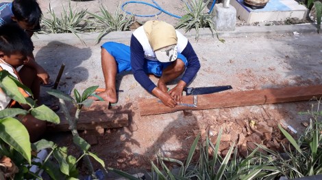 Alles wordt met de hand gemeten en gezaagd. Alleen voor het boren van gaten in de balken wordt eeen electrische boor gebruikt. Het is het ouderwetse handwerk.