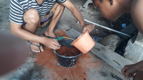 Een rode baksteen wordt fijn gewreven tot poeder. De poeder gaat in een emmer.