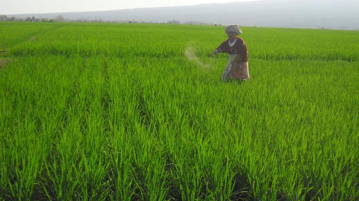 Het strooien van kunstmest op de sawah’s, heel vaak nog met de hand.