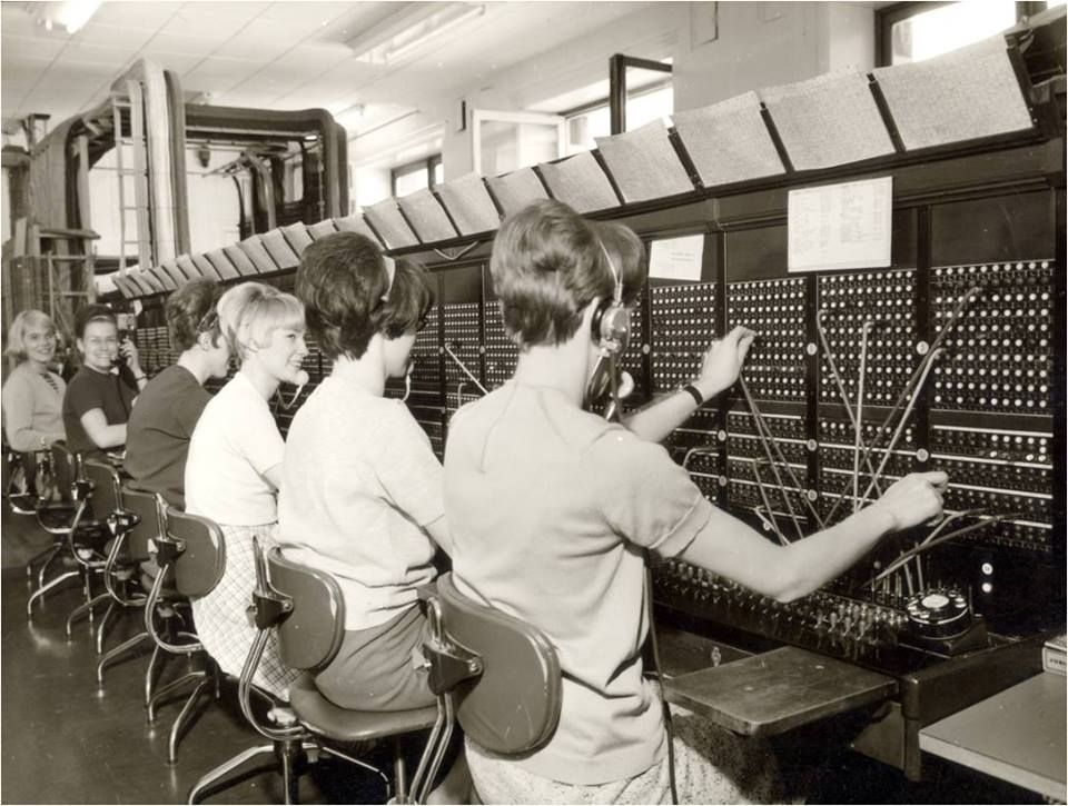 De telefoongesprekken werden tot stand gebracht via de telefooncentrale, waar telefonistes zeer druk in de weer waren met het verplaatsen van vele stekkertjes in een groot scherm met heel veel gaatjes. Een combinatie van stekkertjes en bepaalde gaten leverde een verbinding op.
