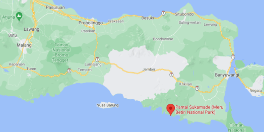 Lokatie Sukamade Beach: Desa Sarongan, Kecamatan Pesanggaran, op ongeveer 95 km ten zuid-oosten van Jember. Gelegen in het Meru Betiri Nationaal Park.