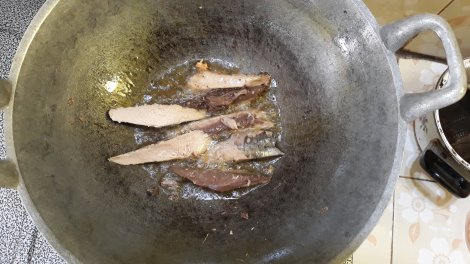 6) De stukjes tongkol bij de sambal doen; goed mengen en even frituren.