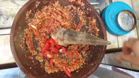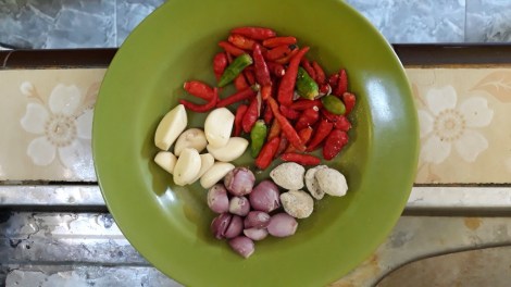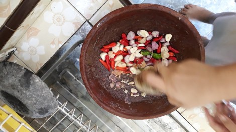 3) Sambal maken: de pepertjes, knoflook, shalotjes en kemiri-noten fijn maken
