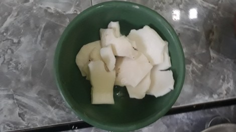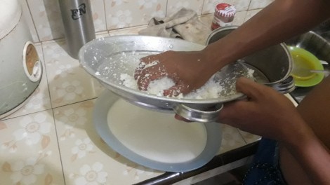 De geraspte kokosnoot wordt met wat water uitgewrongen