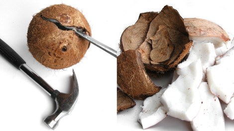 De kokosnoot bevindt zich in een groene bolster. Deze wordt na de oogst verwijderd, waarna de harige, houten noot verschijnt, die in de winkels ligt. De kokosnoot heeft 2 schillen: de harige, houten (dikke) schil, en een dunne schil daaronder. De harige schil is lastig te verwijderen, hier gebruikt men een kapmes voor. Is de harige schil eenmaal verwijderd, dan moet de dunne schil worden verwijderd, ook dit gebeurd met een kapmes. De witte stukken kokosnoot blijven dan over, en die worden gebruikt voor het maken van de santen.