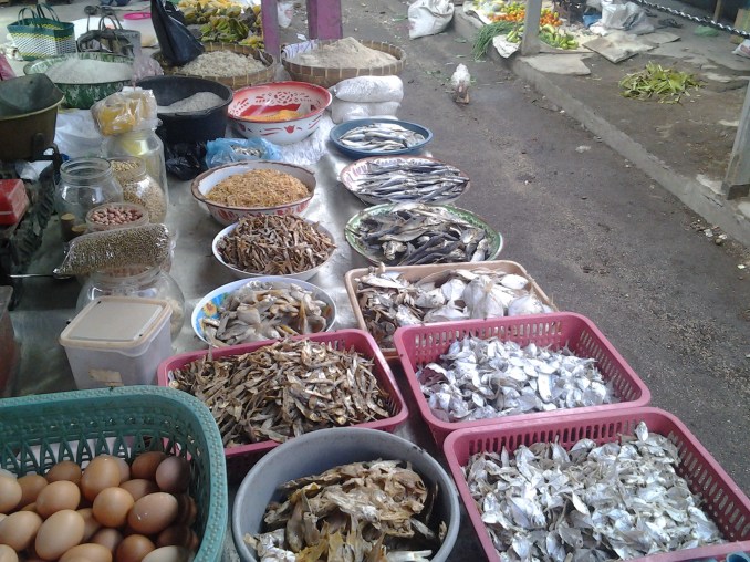Op de lokale markt in mijn desa is van alles te krijgen: kip en vis, groenten, fruit, tahu/tempe, snacks, kleding, schoeisel en meer.
