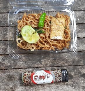 Op de pasar zijn vaak dit soort mini-bungkussen te koop; meestal mie goreng of nasi goreng, met een klein stukje ei, een pepertje en een stukje komkommer.