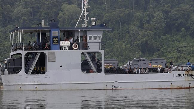 De ferry naar de gevangenis Nusa Kembangan met daarop de politietank met de gevangenen.