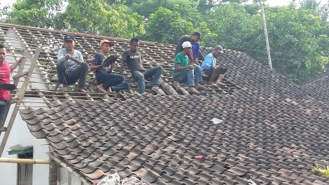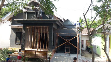 Aan mijn huis werken 2 tukangen, aan het huis van oma werken ook 2 tukangen. De tukangen krijgen hulp van jongemannen uit mijn straatje.