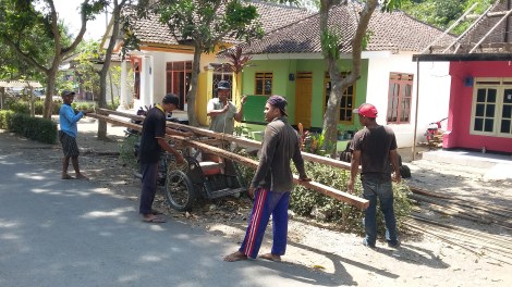 Het materiaal wordt aangevoerd met een kleine vrachtwagen, of met de becak.